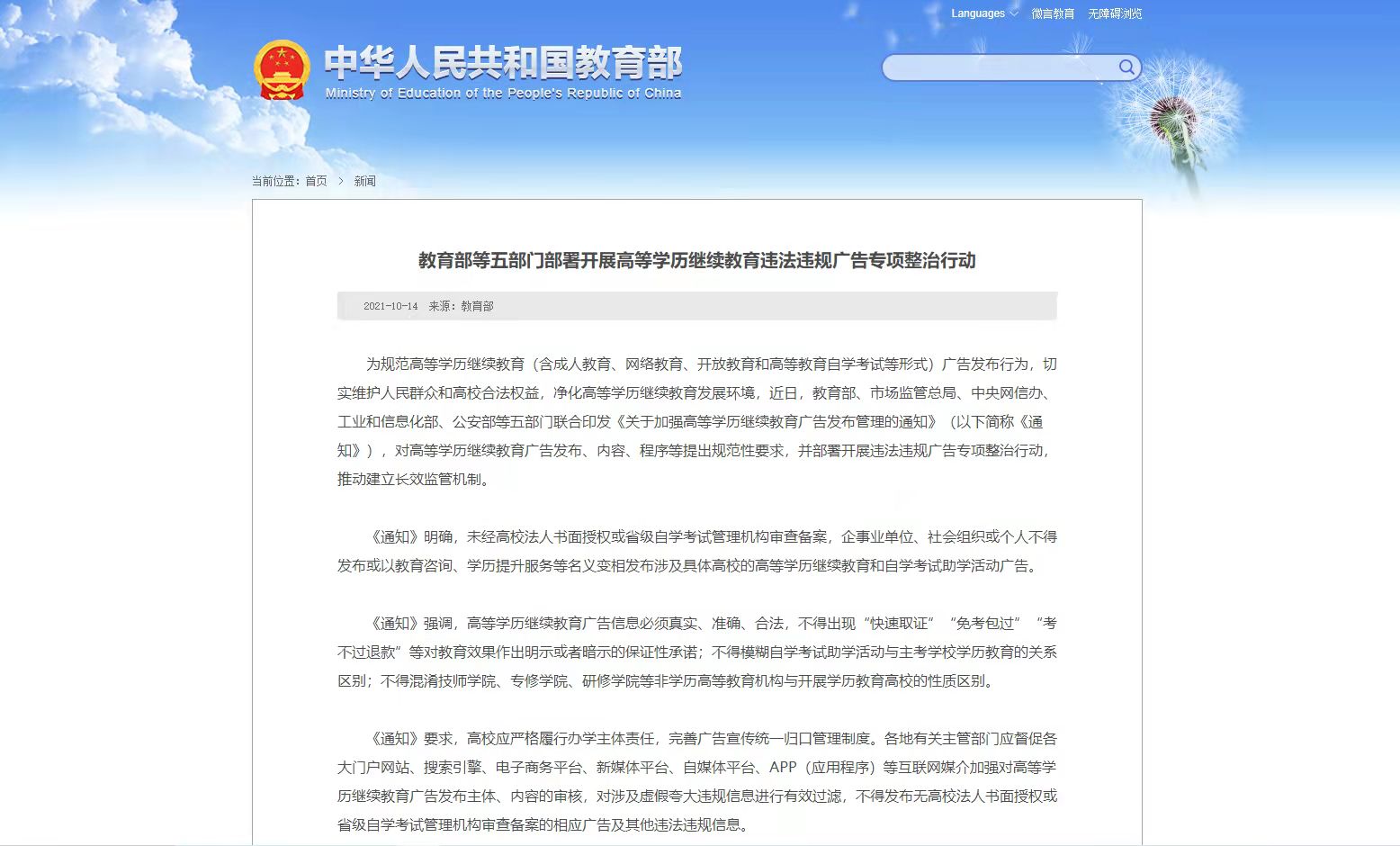 教育部等五部门:规范高等学历继续教育广告发布