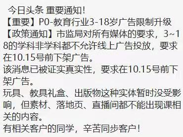 资讯【今日头条】K12教育行业3~18岁广告限制升级:禁止投放!2021-10-15 1851 0举报转U渠道交流群~如图:(真实性仅供参考)今日头条 重要通知!市监局对所有媒体的要求,3~18的学科非学科都不允许线上广告投放,要求在10.15号前下架广告。该消息已被证实直实性,要求在10.15号前下架广告。玩具、教具礼盒、出版物这种实体暂时没受影响,但素材、落地页、直播间都不能出现课相关的内容。有相关客户的同学,辛苦同步客户!
