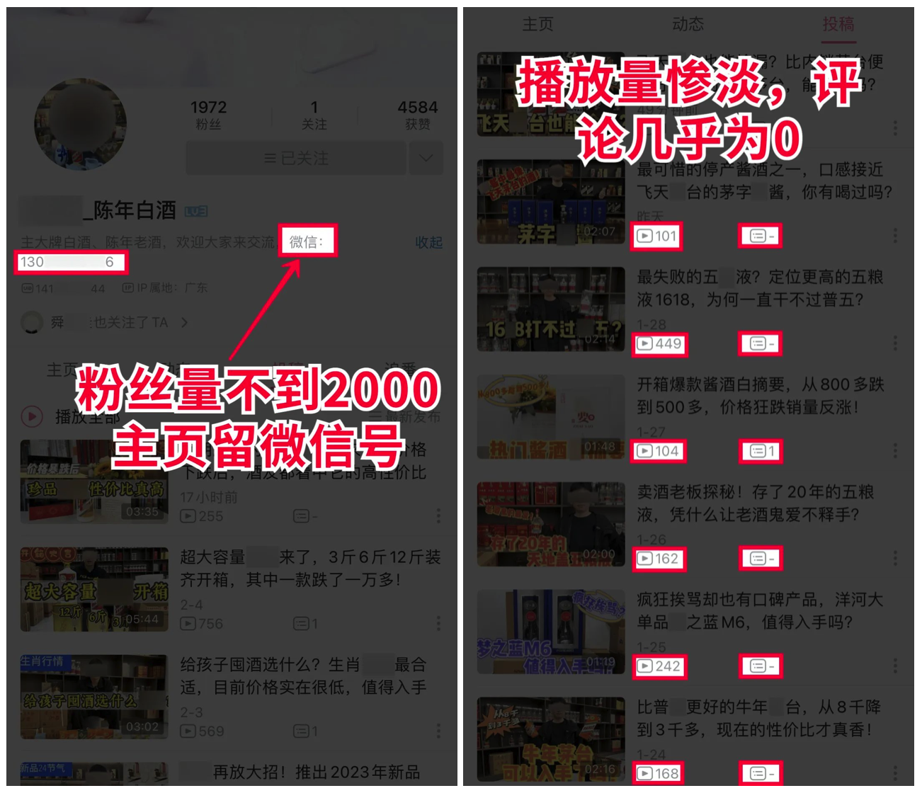 以白酒行业为例,如图,案例账号粉丝不到2000,播放量一坨狗屎,评论几乎没有,但朋友圈卖货卖的飞起。