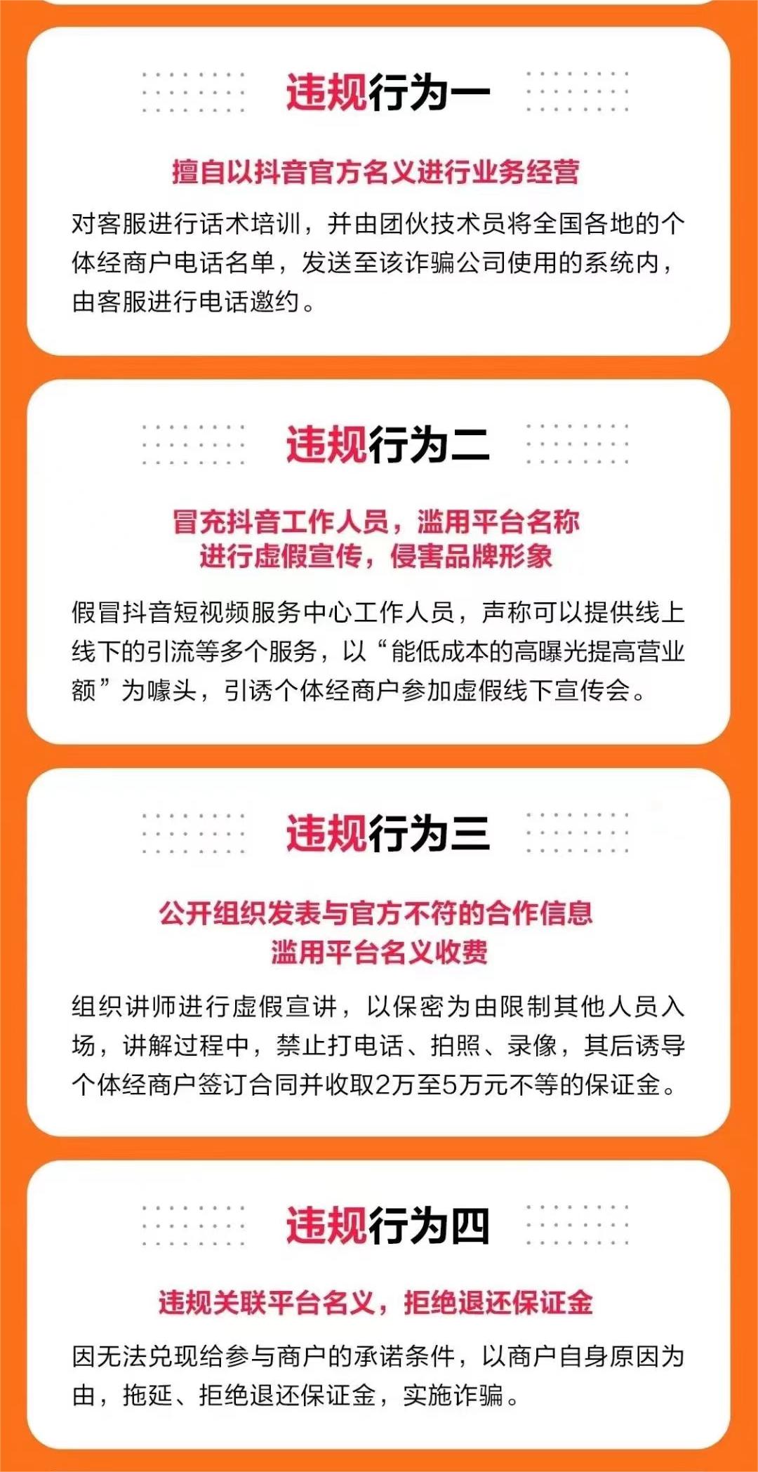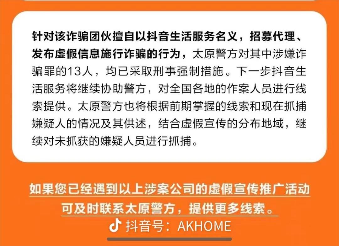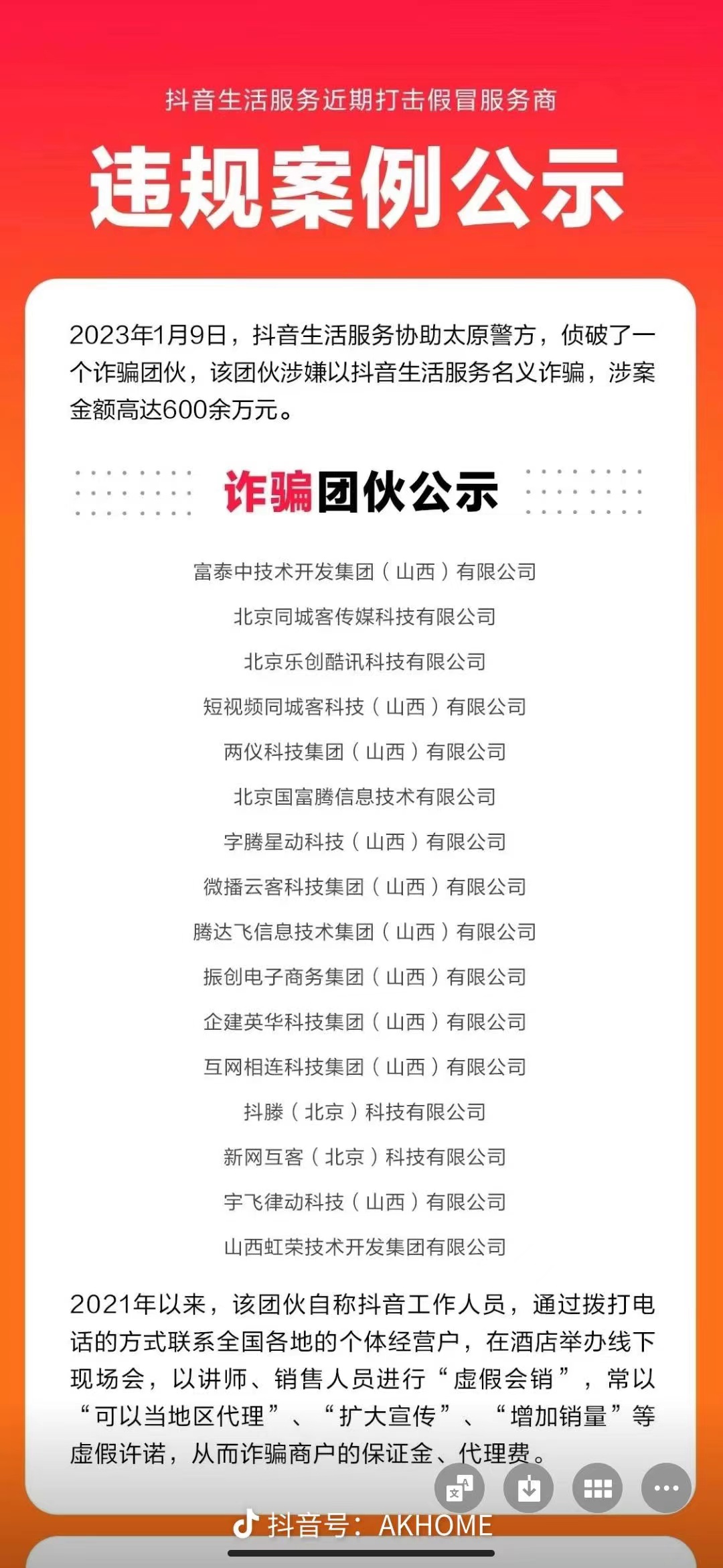 资讯利用抖音诈骗600万,这些公司真刑啊!进来闭坑2023-02-24 924 0举报下图来源于抖音号:AKHOME据悉,2023年1月9日,抖音生活服务协助太原警方抓获一诈骗团伙,该团伙打着抖音生活服务的名义诈骗了600多万元,该团伙具体名单以及违规行为见下图: