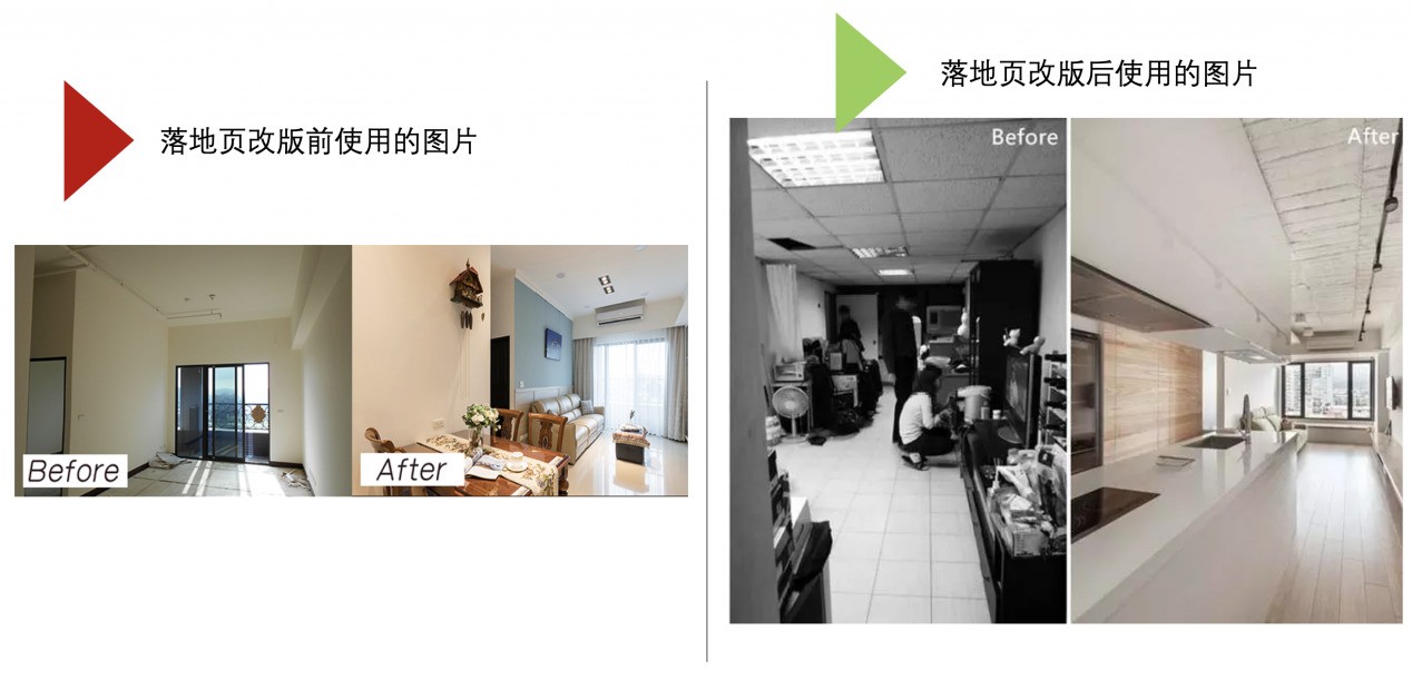 改版前,装修前后对比图都是彩色图——2张图片元素都较复杂,一眼看上去,无法产生鲜明的对比;改版后,巧妙的采用黑白/彩色的对比,让焦点集中在装修后的明亮,形成很好的反差。