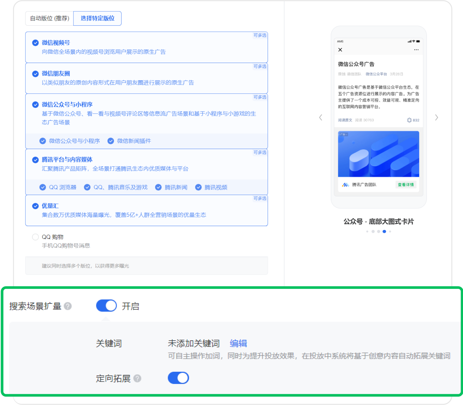 定向:开启定向拓展,系统智能匹配主动搜索人群。