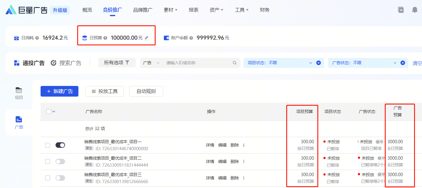 所以我们一般都是在项目预算上给设置一定的门槛,比如刚开始做的计划设置一个几百到一千的预算,然后在广告预算当中设置一个三五千的预算。