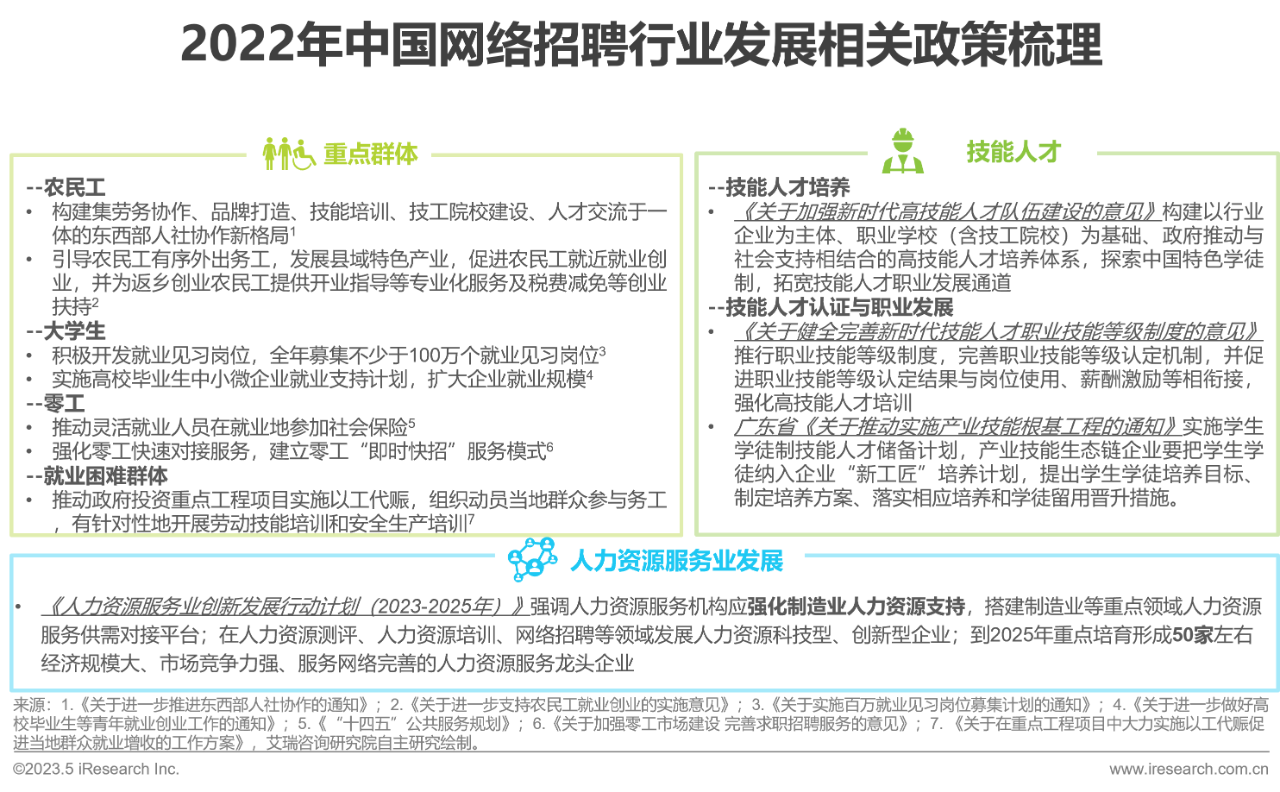 2022年在国际环境更趋复杂严峻、新冠疫情多点散发、产业结构调整和政策调控等多重因素的共同作用下,企业的用人需求在行业和岗位层面呈现出分化的特点,根据艾瑞咨询研究院估算,2022年中国网络招聘市场规模为175亿,增速有所放缓,较2021年增加9.2%。2023年,随着我国疫情防控政策的实质性调整,预计经济循环将有效加速,经济整体持续稳定恢复,将带动就业需求扩大,增加就业岗位,网络招聘行业市场规模增速有望回升。