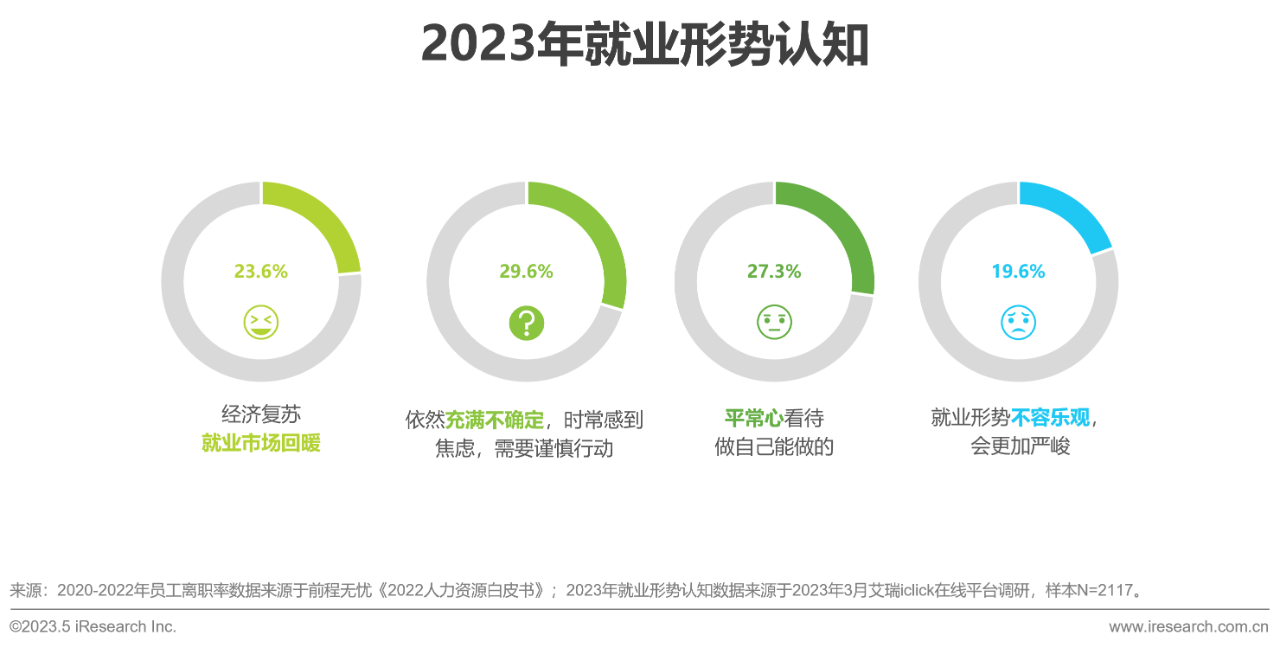 2022年经济持续低迷,部分行业和企业就业机会大幅缩减,在不确定性的笼罩下,职场人更倾向于求稳,跳槽意愿减弱,2022年员工主动离职率为12.7%,较2021年下降1.4%。艾瑞调研数据显示,求职者和在职人士认为2023年就业市场回暖的比例不足1/4,相应地,超过60%的求职者在找工作时会将工作稳定性视为主要考量因素,仅次于薪资福利水平(74%)。