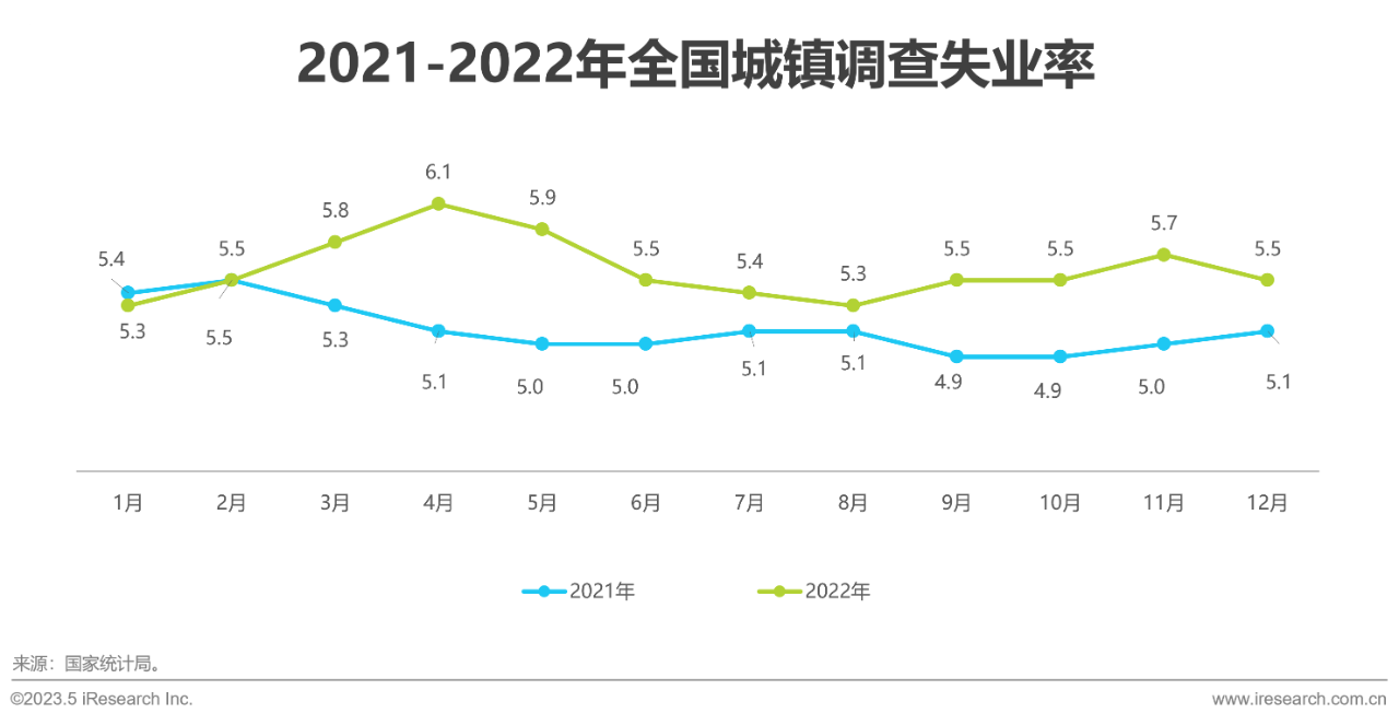 2022年全国高校毕业生人数突破千万,达1076万人,疫情后留学回国人数也大幅上升,同时互联网、房地产、教培行业人才重新进入就业市场,整体就业形势严峻,全年城镇调查失业率均值为5.6%,比2021年上升了0.5个百分点。而青年就业群体的结构性失业矛盾本就更加突出,再叠加周期性失业因素,2022年我国16-24岁青年劳动力失业率全年处于15%以上,相较去年同期高出3个百分点。
