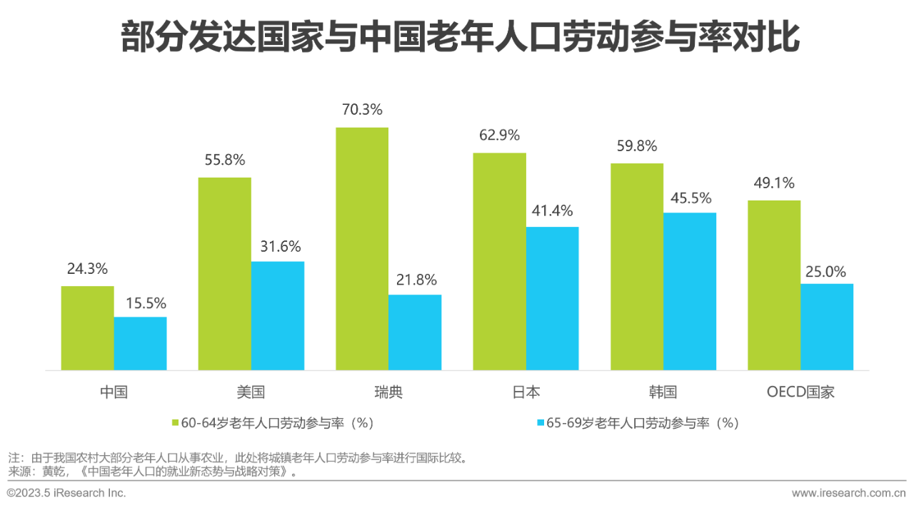 2022年2月,国务院印发《“十四五”国家老龄事业发展和养老服务体系规划》,提出实施渐进式延迟法定退休年龄。韩国、日本、美国、瑞典等国的法定退休年龄均为65+,其老年人口劳动参与率明显高于我国。随着弹性退休制度的不断完善,我国老年人口劳动参与率将呈上升趋势。但老年人口进入就业市场仍面临着较多阻碍,一是专业技能和企业岗位要求错配问题更加突出,导致就业选择有限,二是相关法规和政策对于退休人员再就业的保护和支持力度不够,三是接触就业机会的途径有限。