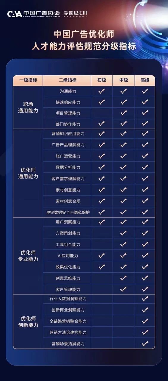 在这种现状下,中国广告协会联合阿里巴巴旗下超级汇川广告平台及行业专家们共同推出《中国广告优化师人才能力评估规范团体标准》(下文简称“人才标准”) ,规范中国广告优化师人才能力评估分级要求,为互联网广告从业者提供切实可行的方案。