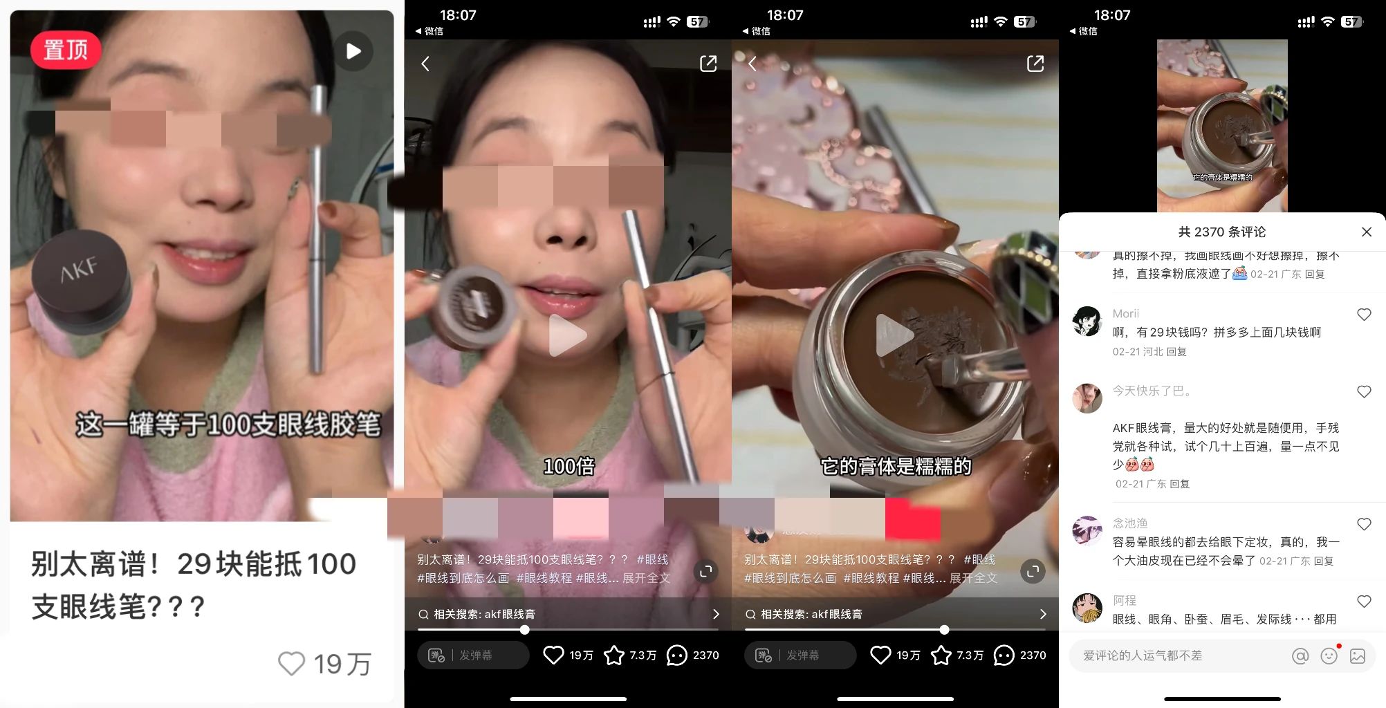 小红书爆文内容:博主种草“AKF眼线膏”,从克数,对比,质地和展示分别把眼线膏笔的亮点展示的淋漓尽致,特别是质地的展示,给人一种不管是新手还是老手都能信手拈来的感觉,直接就对博主的推荐种草了