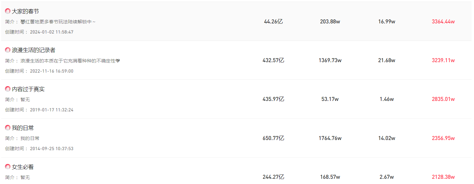 其中“大家的春节”话题近30天有44.26亿的总浏览量,近30天笔记增量,16.99w篇,互动增量3364.44w;“浪漫生活的记录者”话题近30天有432.57亿的总浏览量,近30天笔记增量,21.68w篇,互动增量3239.11w;
