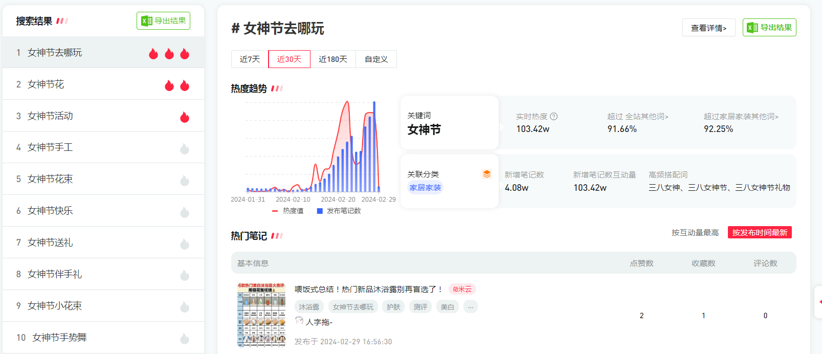 节假日接下来还有女神节,很多商家在春节的时候就已经开始在布局女神节的内容以及关键词布局了,临近时做爆文优化,放大笔记曝光量。
