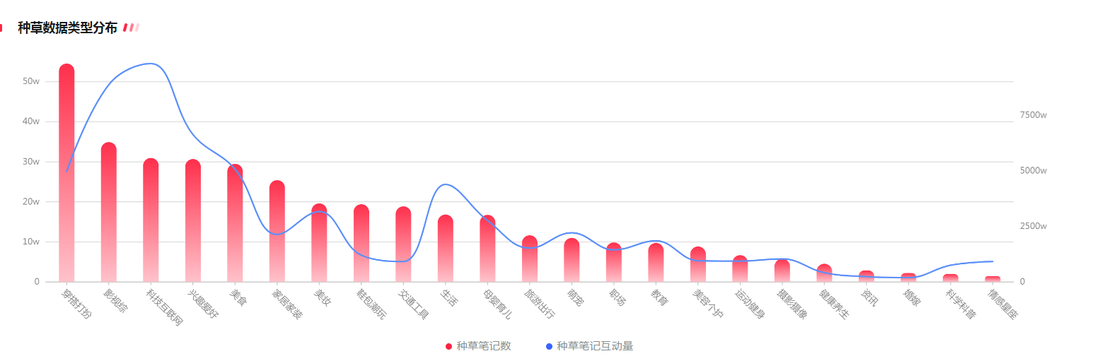 根据新红数据-种草流量大盘数据显示,近30天小红书穿搭打扮行业发布种草笔记数:54.53w篇,种草笔记互动量:4973.89w,尤其是在新年和开春这样的节点,小红书用户对于更新自己的着装和造型更加迫切。