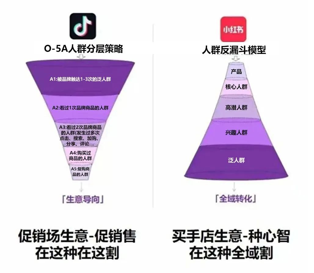 这也是为什么抖音的方法论是正漏斗人群分层策略,而小红书的方法论是反漏斗人群破圈策略。