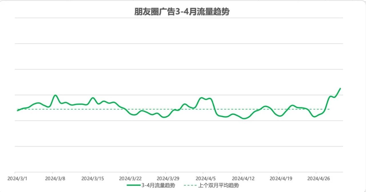 2024年 3-4月,朋友圈整体流量非常宽裕,同比去年有 5%左右流量增量。其中妇女节、五一期间用户活跃度较高将会迎来流量高峰,建议广告主合理增投,把握流量机会获取更多曝光。