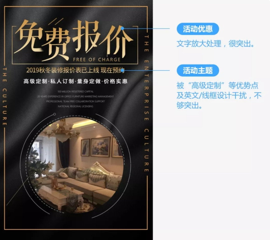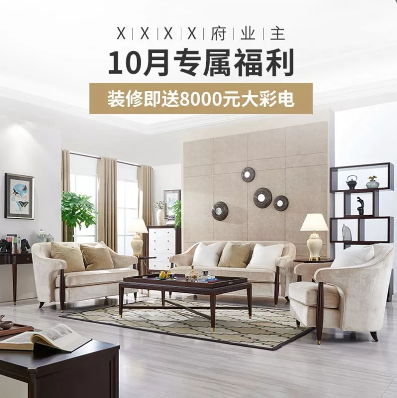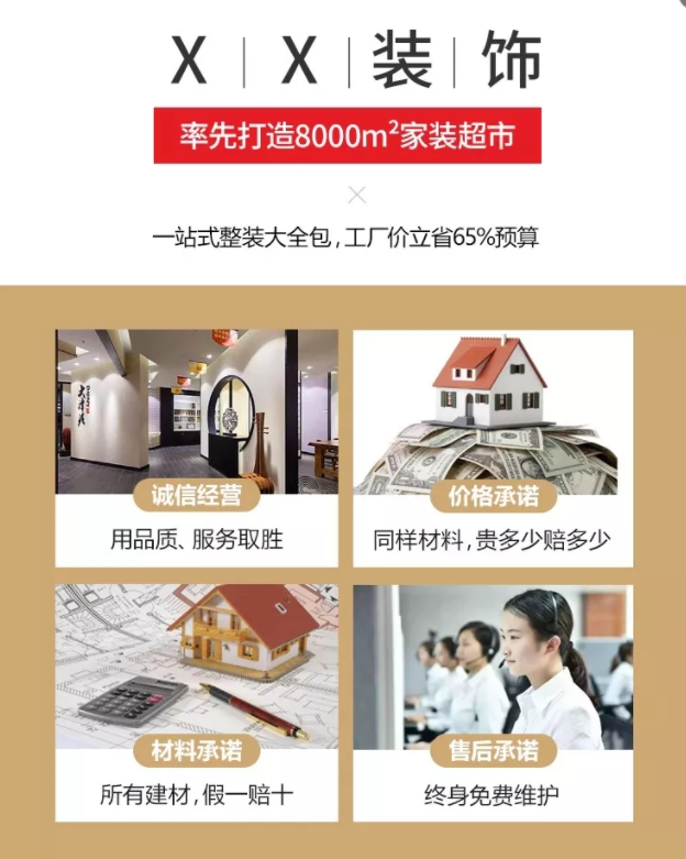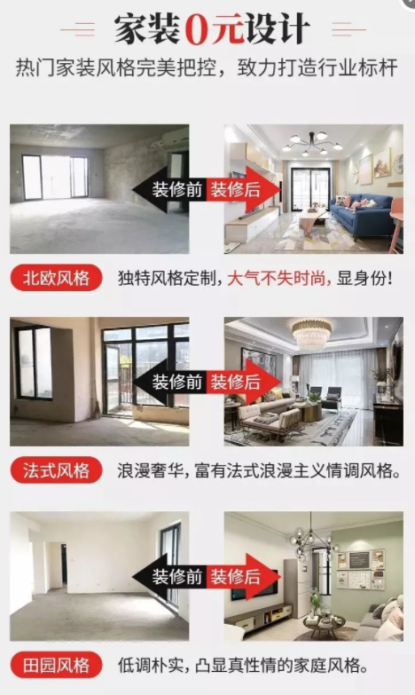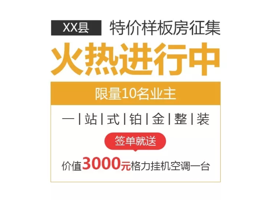 比如特惠:全屋装修699元/㎡、全屋装修12.98万、30套样板房免费装修、装修送5999元家电等;如果没有优惠,可从免费服务入手。