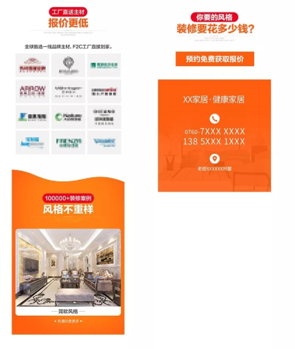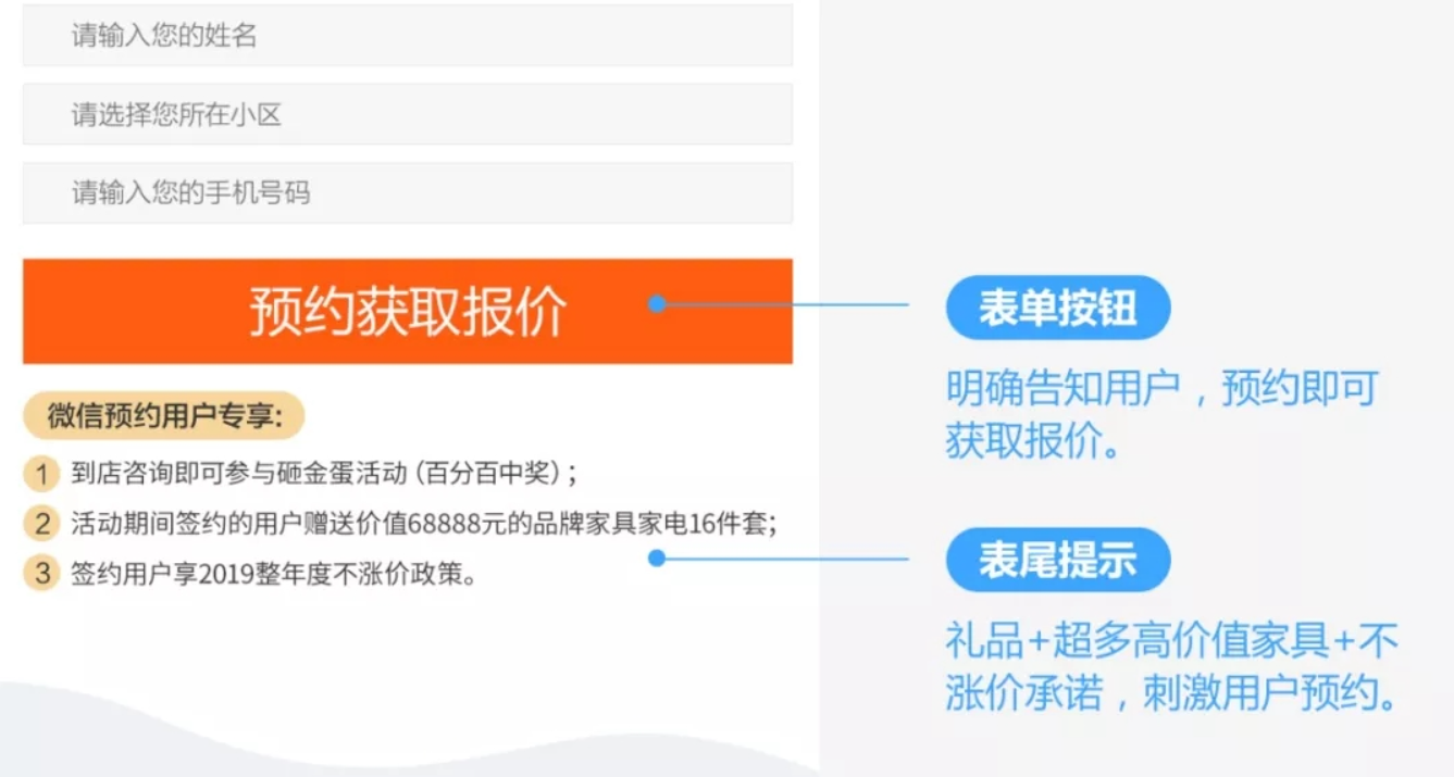 转化按钮:行动指引要明确,比如点击获取装修报价、预约免费设计、点击领取设计方案、领取100+装修效果图、下单抵2000元费用等。