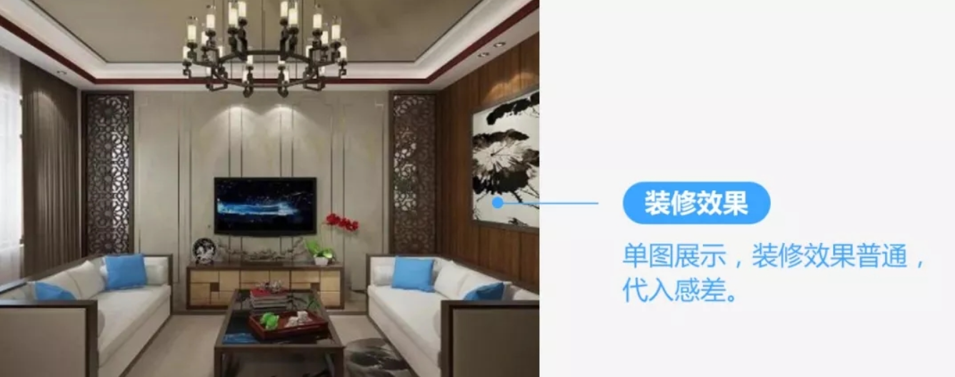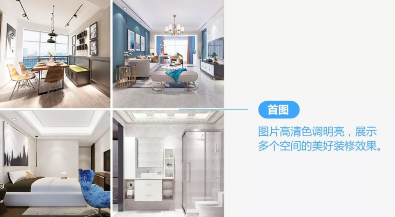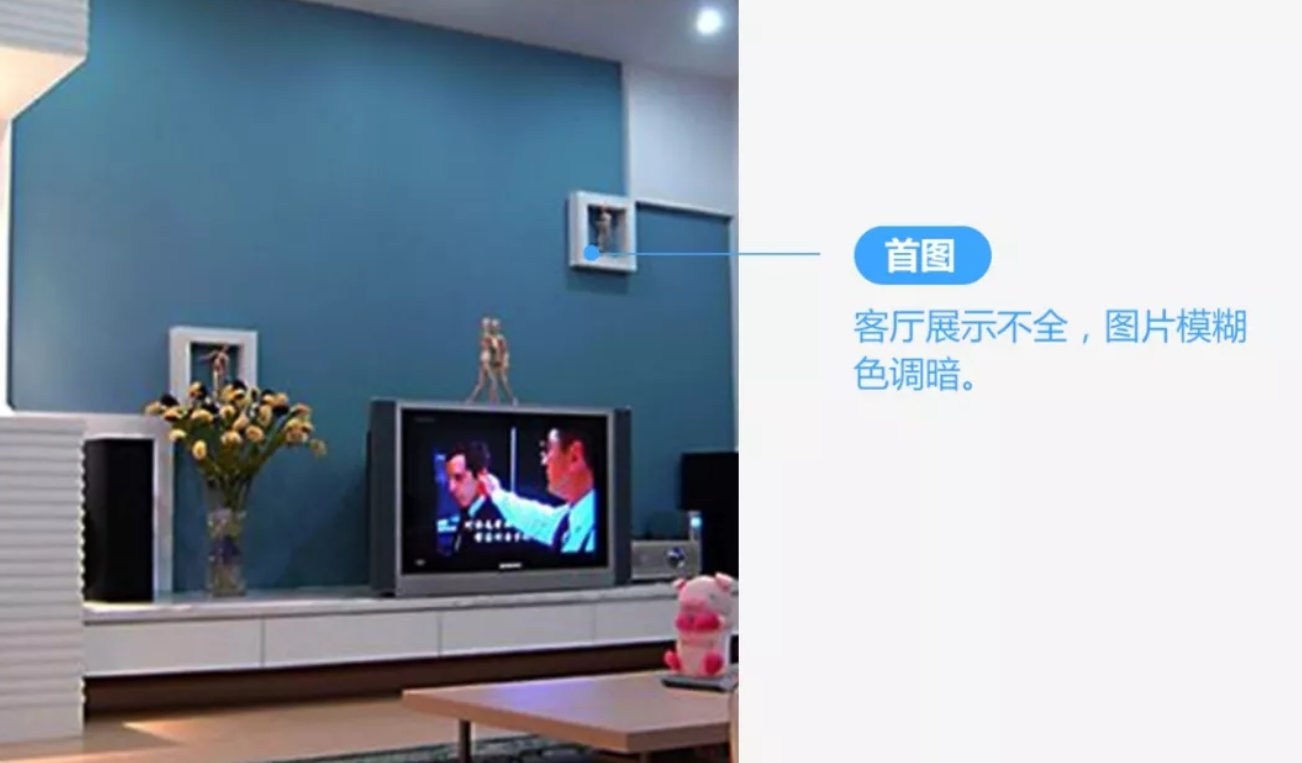 首图是落地页的第一印象,要营造装修后的美好效果,以激发用户兴趣。而这张图空间展示不全,图片模糊,色调暗淡,难以勾起用户兴趣。