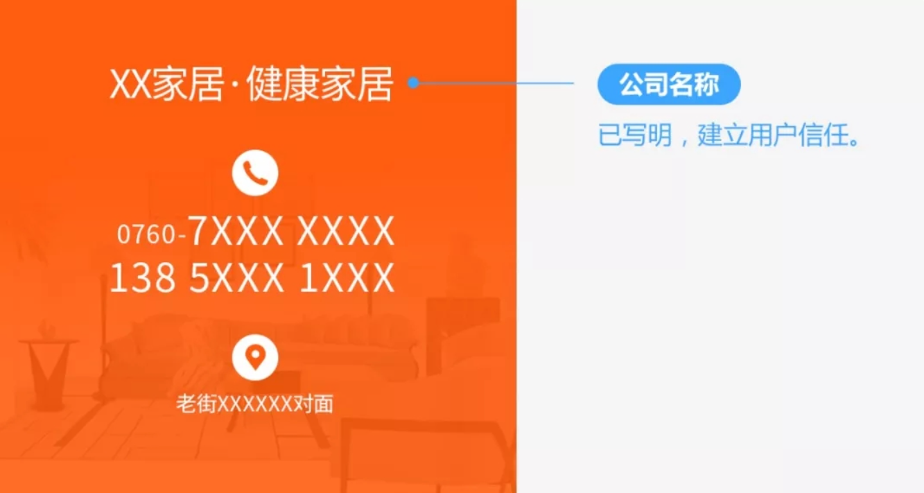 可从企业/品牌介绍,公司名、联系方式,或荣誉、用户量、门店数量、覆盖城市、大公司合作等方面去建立用户信任。