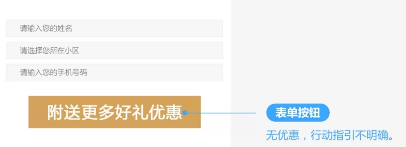 表单按钮,既无明确的优惠刺激,又无行动指引,用户都不知道填表要干什么。
