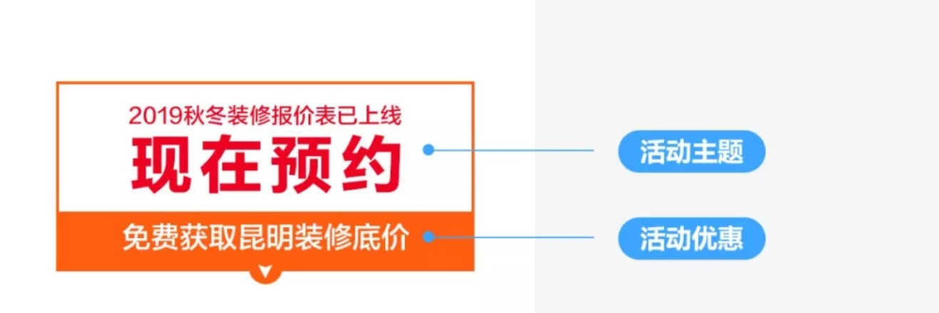 去掉多余内容,仅保留活动主题和活动优惠,清晰直观。且强调“昆明”本地,大大激发了昆明用户的装修行动欲望。