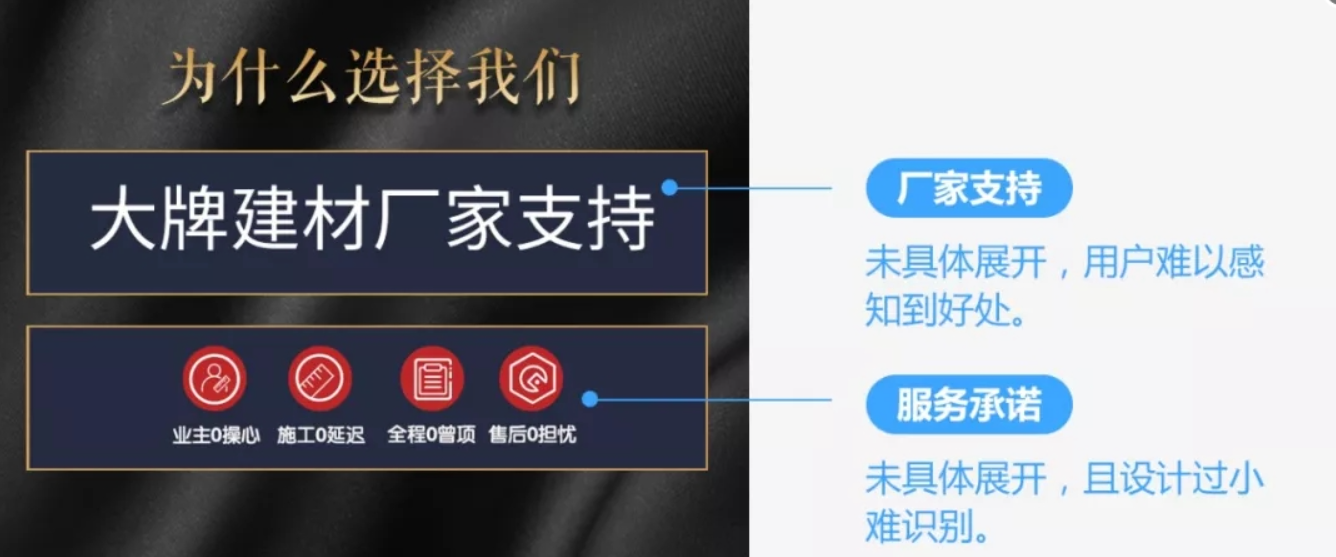 但有些优势没有具体展开,用户无法感知到实际好处;装修效果单图展示,效果普通,没有营造美好家的代入感。