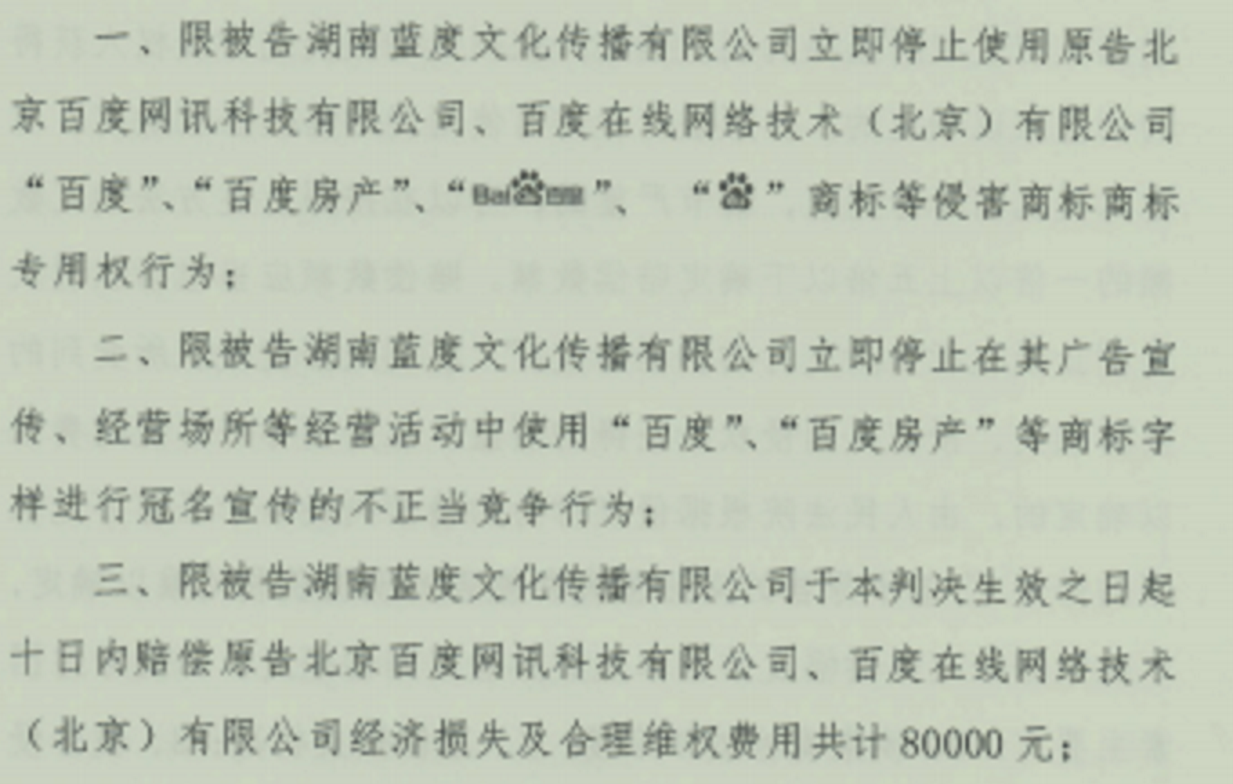 长沙市岳麓区人民法院针对湖南蓝度文化传播有限公司(下称 湖南蓝度 )未经授权使用百度商标及不正当竞争行为依法作出判决,判决明确要求,湖南蓝度立即停止侵害百度公司商标专用权行为,并湖南蓝度立即停止在其广告宣传、经营场所等经营活动中使用“百度”、“百度房产”等商标字样进行冠名的不正当竞争行为。