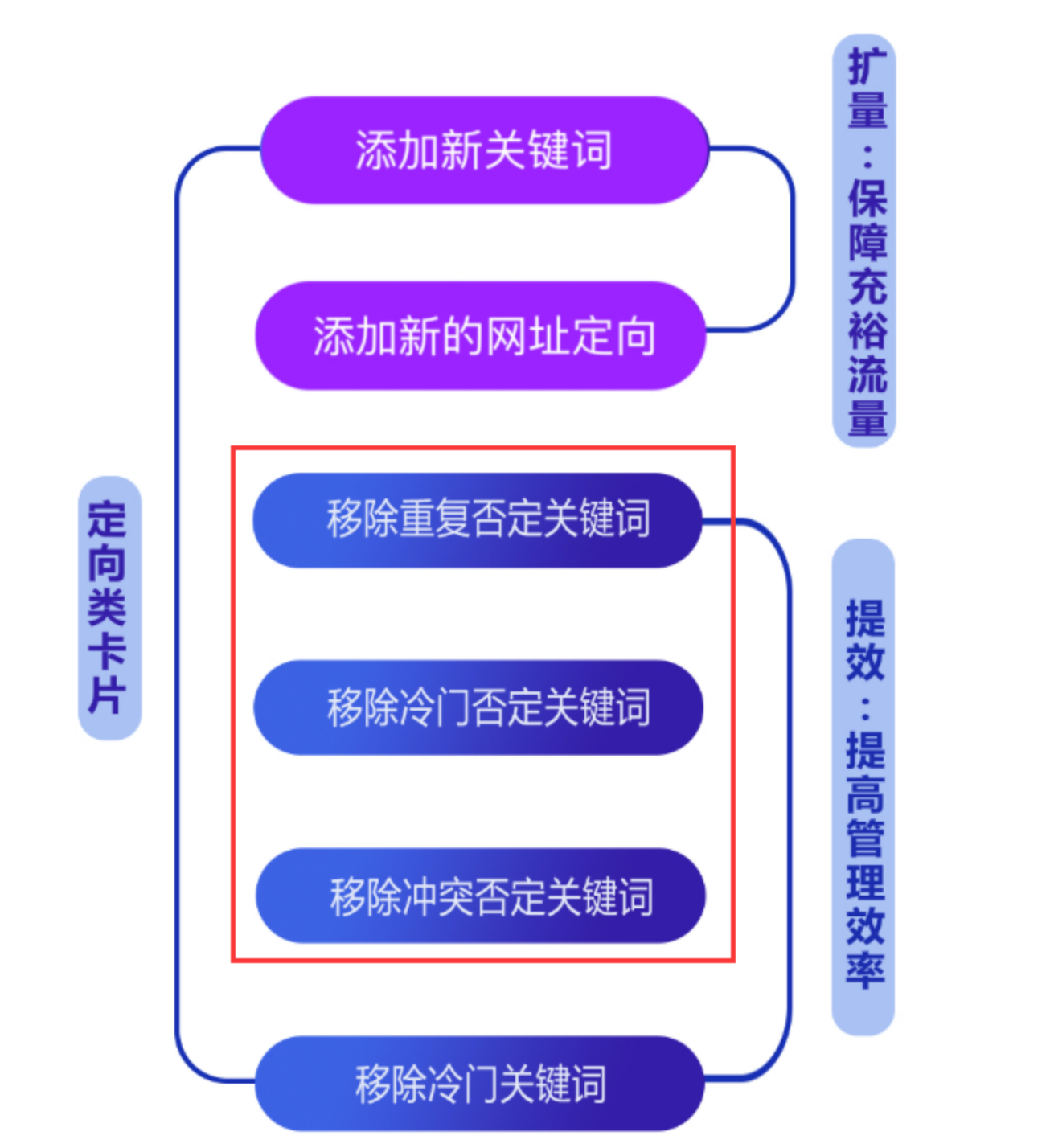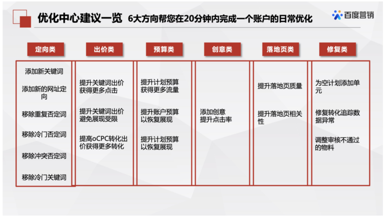 在定向上,凤巢后台给出了6个维度的建议,添加关键词、添加新的网址定向、移除重复否定词、移除冷门否定词、移除冲突否定词、移除冷门关键词。