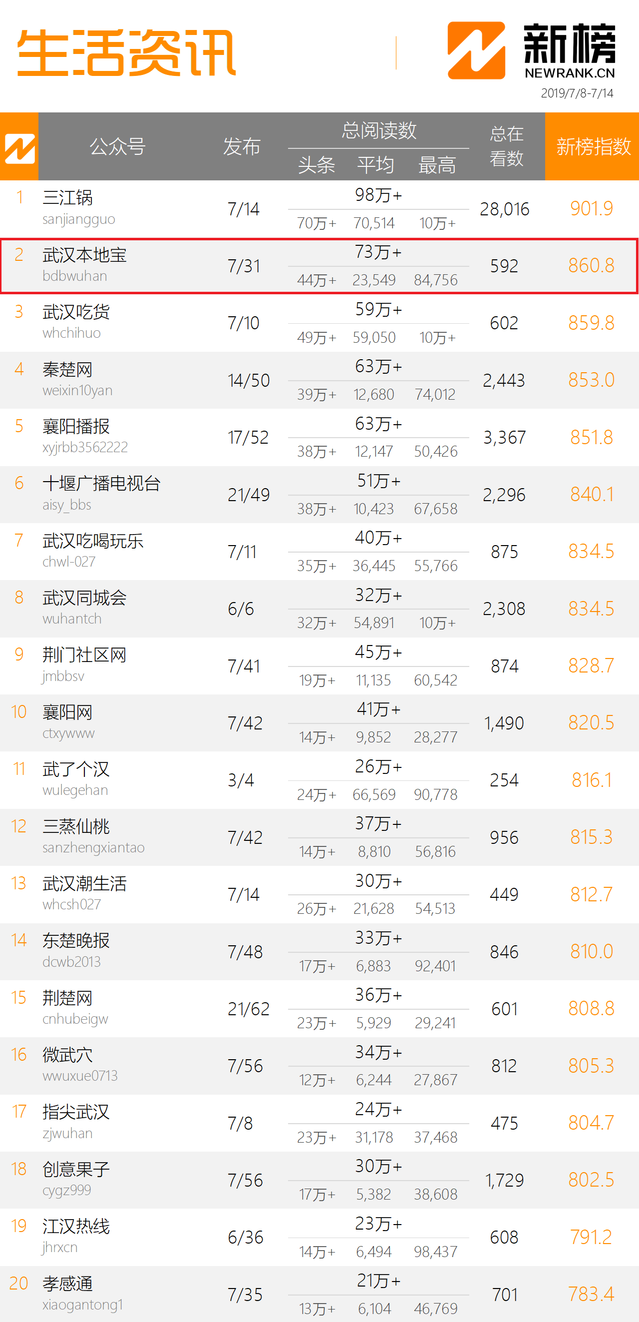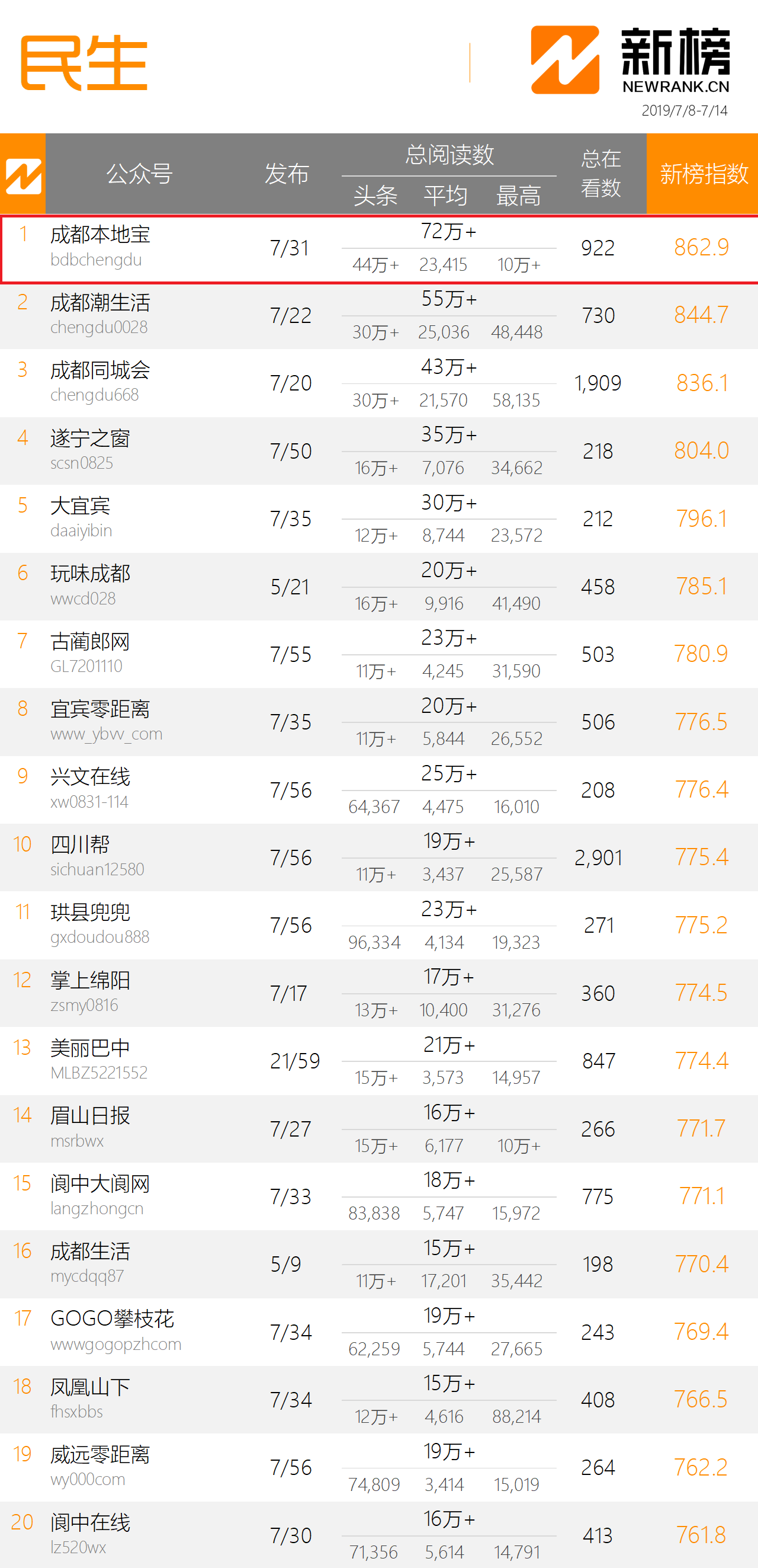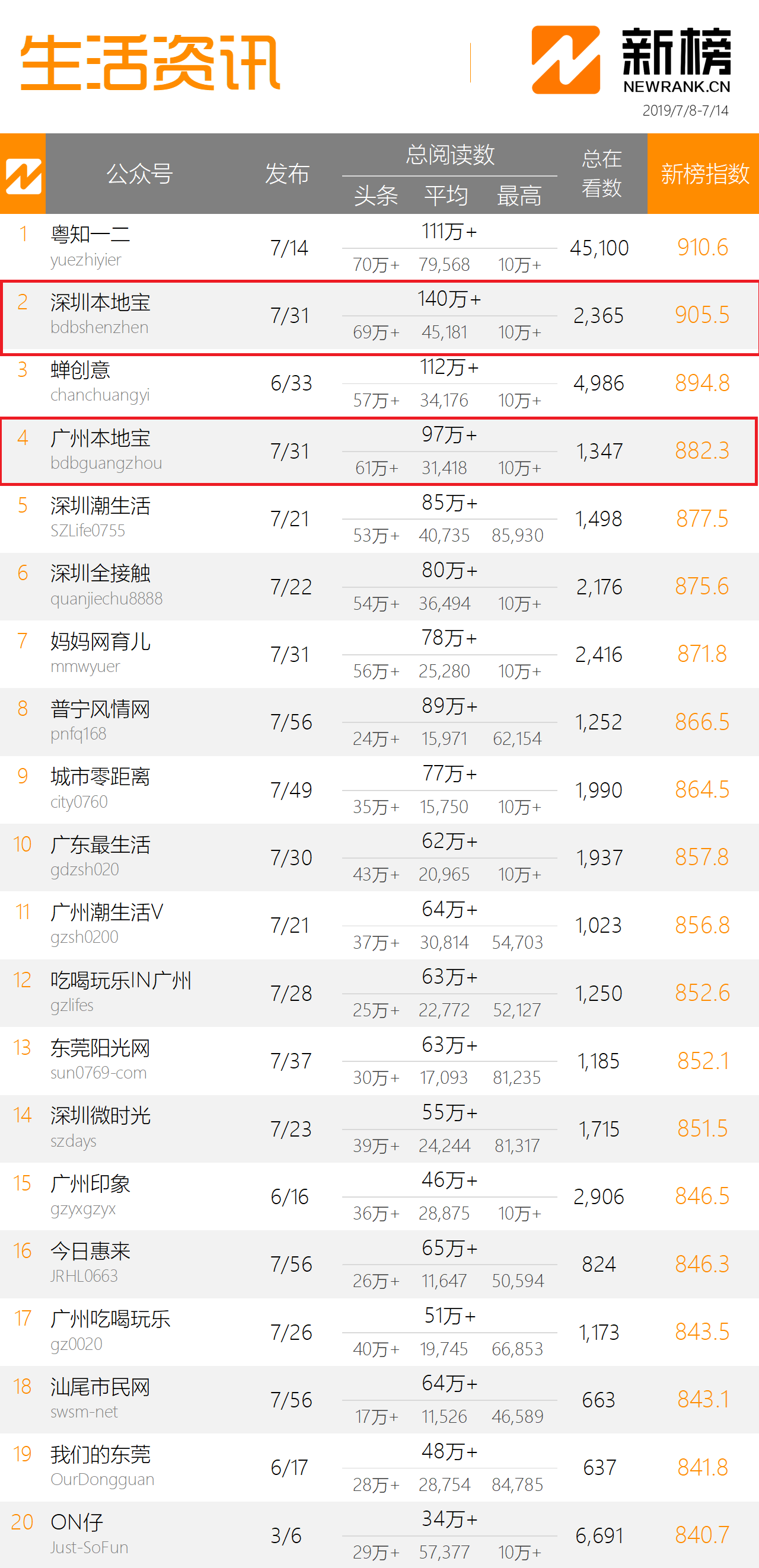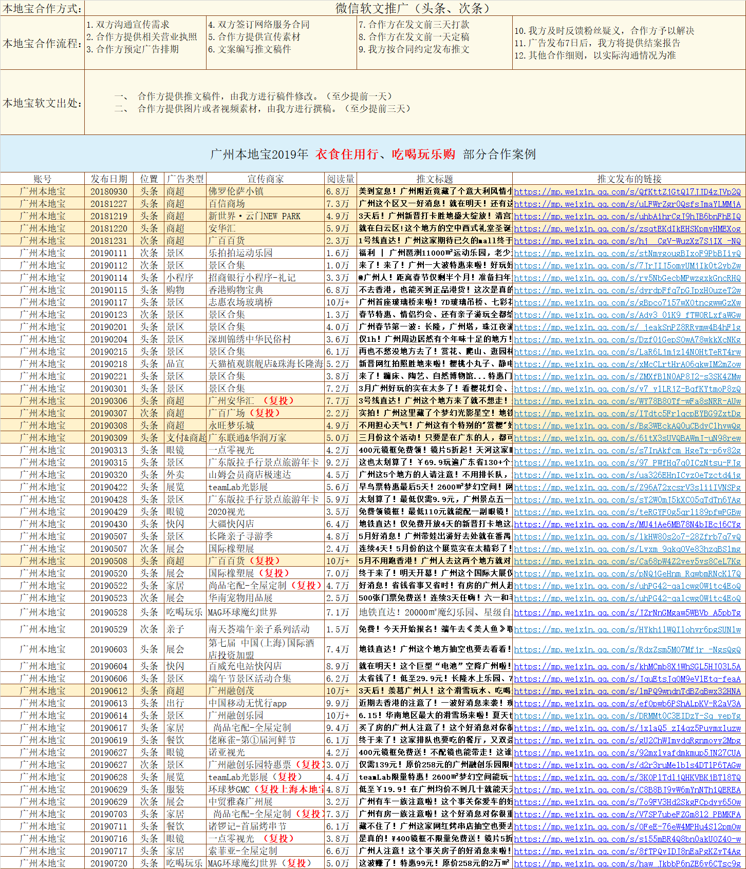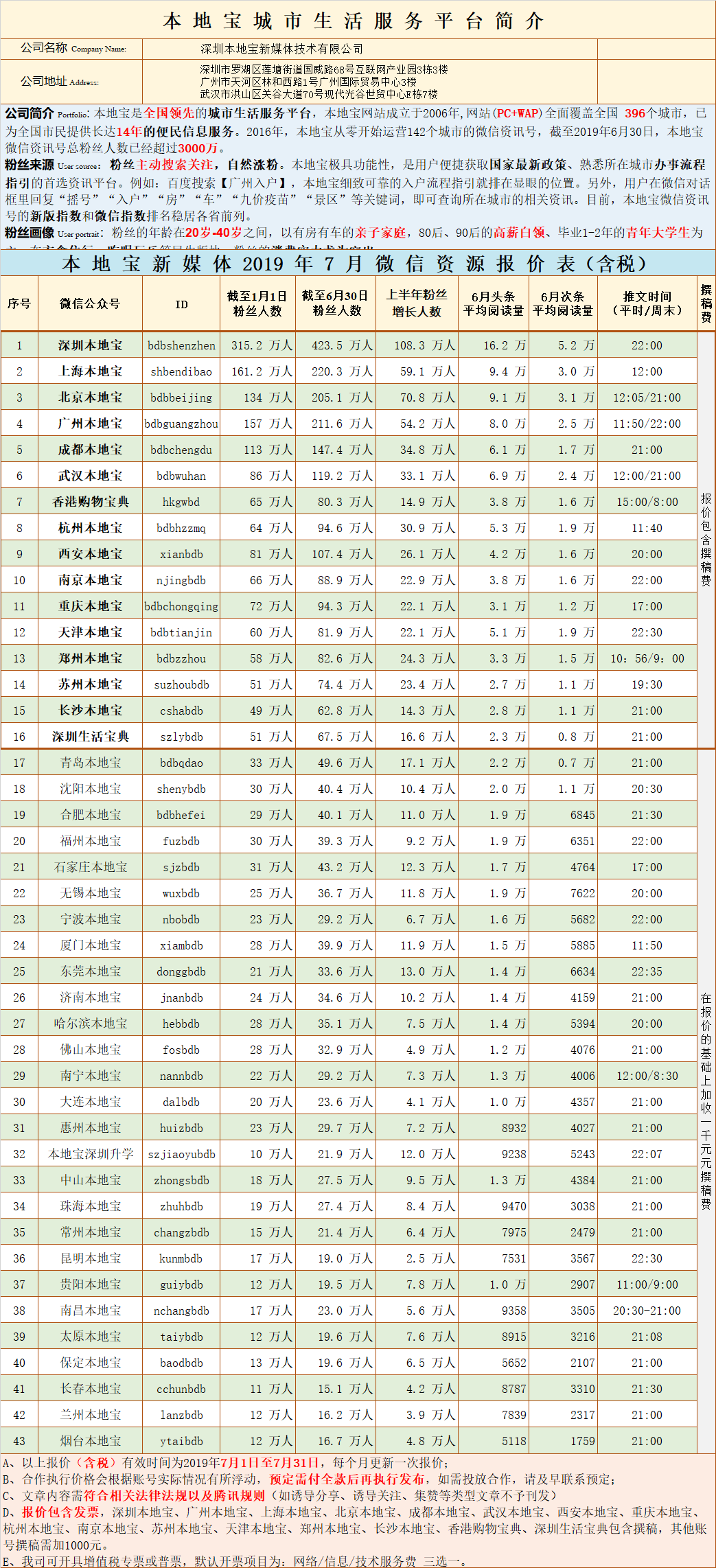 公司简介 Portfolio: 本地宝是全国领先的城市生活服务平台,本地宝网站成立于2006年,网站(PC+WAP)全面覆盖全国 396个城市,已为全国市民提供长达14年的便民信息服务。2016年,本地宝从零开始运营142个城市的微信资讯号,截至2019年6月30日,本地宝微信资讯号总粉丝人数已经超过3000万。 粉丝来源 User source:粉丝主动搜索关注,自然涨粉。本地宝极具功能性,是用户便捷获取国家最新政策、熟悉所在城市办事流程指引的首选资讯平台。例如:百度搜索【广州入户】,本地宝细致可靠的入户流程指引就排在显眼的位置。另外,用户在微信对话框里回复“摇号”“入户”“房”“车”“九价疫苗”“景区”等关键词,即可查询所在城市的相关资讯。目前,本地宝微信资讯号的新版指数和微信指数排名稳居各省前列。 粉丝画像 User portrait:粉丝的年龄在20岁-40岁之间,以有房有车的亲子家庭,80后、90后的高薪白领、毕业1-2年的青年大学生为主。在衣食住行、吃喝玩乐等民生版块,粉丝的消费实力尤为突出。 粉丝增幅 User increment:微信用户主动关注,粉丝取关率超低,2019年上半年,本地宝主要运营的43个微信资讯号保持自然涨粉,用户数量激增800万+。