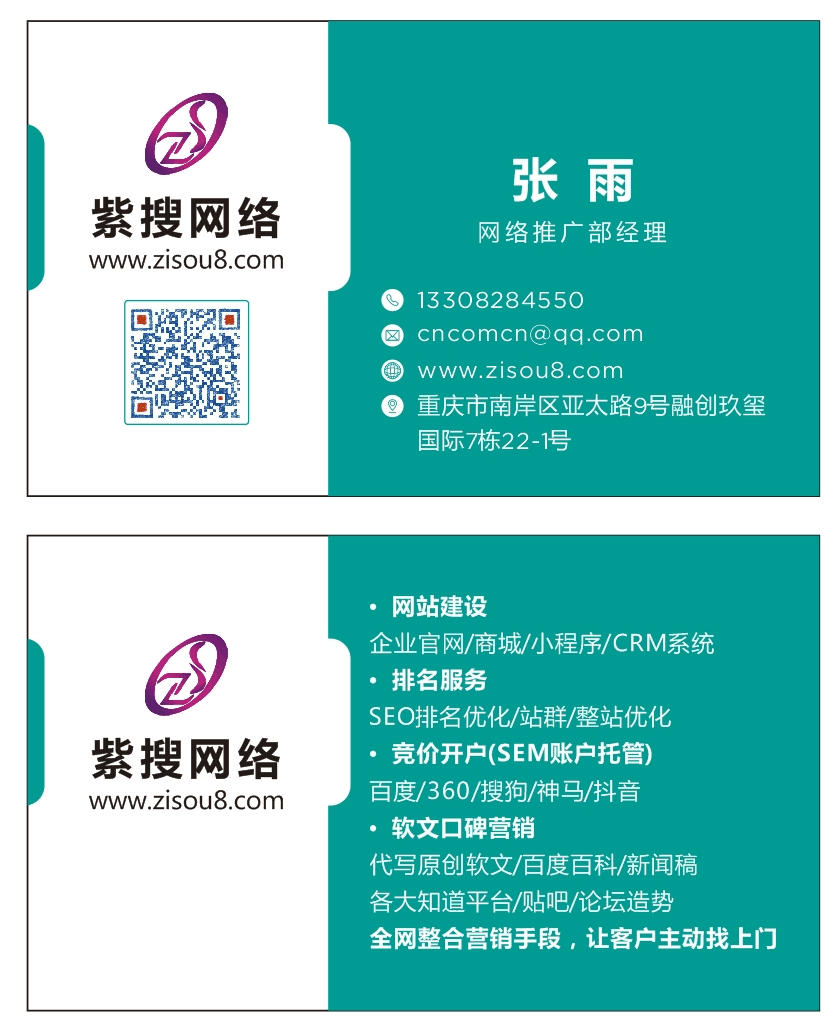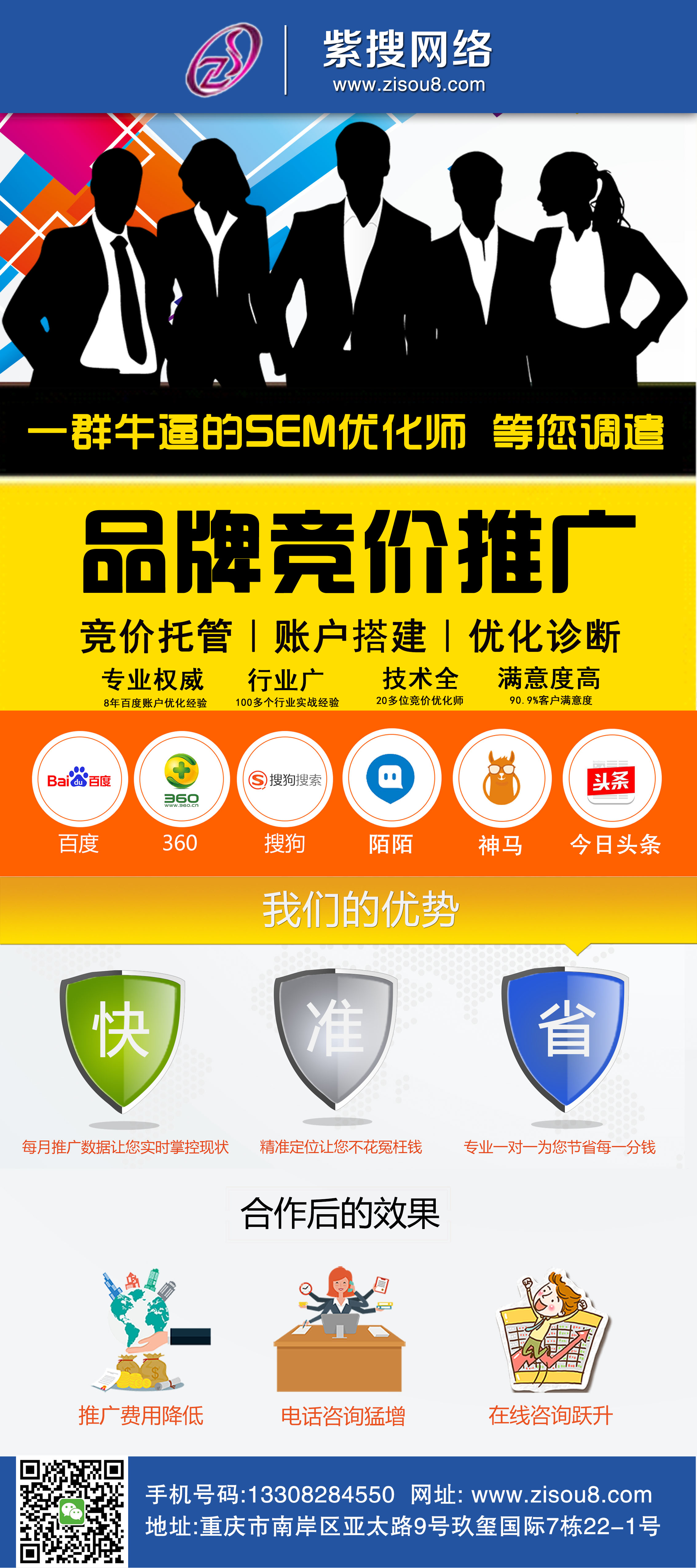 一、关于我们 紫搜网络 www.zisou8.com 是一家专业从事企业网站建设、网络推广(含全网口碑营销)、手机移动平台开发,品牌0基础孵化,全网营销全托管的网络服务型公司。 二、服务宗旨 以转化为目的,不断优化和探索各类能转化成果的方法,宁可求其稳,不求回报快!专业的事,交给专业的人,好不好是用结果来证明的。 三、服务范围 ★ 有九年网站建设经验(营销型网站收录排名快)。 ★ 提供全国加盟代理行业(百度\搜狗\360\神马)官网开户,返点与框架一至,框架随时有户(包设计页面),欢迎对比。 ● SEO排名优化定制(全行业) ● 外推包收录,隔天上首页。(全行业) ●全网口碑营销-文案编辑(全行业) ● 百度黑帽技术(全行业) ● 百度霸屏(正企) ● 整站权重优化(懂的来)技术硬派型公司,有排名一直做不上来的,欢迎随时过来验证(支持测试) 四、联系我们 紫搜唯一官网:www.zisou8.com 紫搜是一家集技术与资源于一体,并且在重庆、湖北、江苏、广州(仅SEM竞价服务)都有运营公司,不但在竞价账户托管方面有着多年经验,还针对加盟代理行业、游戏app推广、餐饮、家电、教育培训等有着多年经验及大数据支撑,选择紫搜准没错。