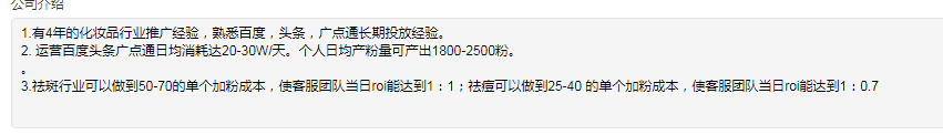 1.有4年的化妆品行业推广经验,熟悉百度,头条,广点通长期投放经验。 2. 运营百度头条广点通日均消耗达20-30W/天。个人日均产粉量可产出1800-2500粉。 。 3.祛斑行业可以做到50-70的单个加粉成本,使客服团队当日roi能达到1:1;祛痘可以做到25-40 的单个加粉成本,使客服团队当日roi能达到1:0.7