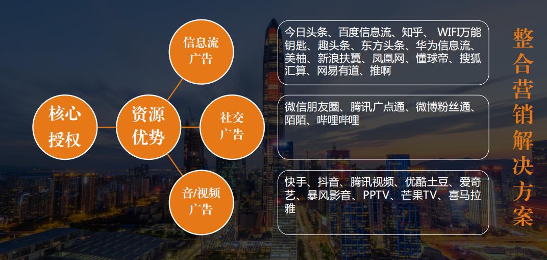 深圳市厚拓科技有限公司——移动互联网营销与服务提供商。旗下设有深圳厚拓科技,广州厚拓科技以及爱创广告。目前我们拥有100+以客户为中心的营销人员,100+全能“管家”型运营人员,30+坚持“工匠精神”的设计人员,20+高效心细的后勤人员。我们为行业坚守真正的情怀和价值,十年沉淀,厚积薄发,我们服务华南区超过50000家企业,其中包括游戏、电商、旅游、教育、品牌、金融、APP等20余个行业,为广告主提供专业的 "品牌策划、媒体投放、效果评估" 的整合营销服务。 信息流广告:今日头条、知乎、wifi万能钥匙、美柚、新浪扶翼、凤凰网、网易有道、百度信息流 社交广告:微信朋友圈、腾讯广点通、微博粉丝通、陌陌 视频广告:快手、抖音、喜马拉雅、优酷视频