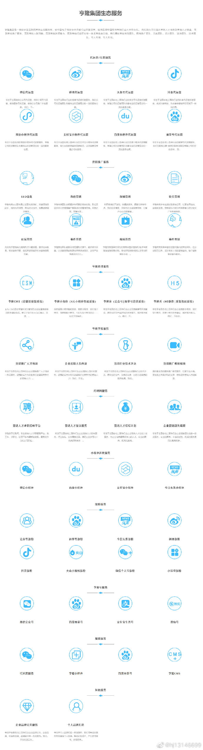 亨隆文化传媒-综合型互联网营销生态服务商,一站式多渠道高返点开户,专业化全行业效果代运营,近十年致力于互联网营销领域,专注于互联网广告运营,帮助企事业提供百度竞价信息流优化、微商推广、今日头条自媒体、新媒体运营等方面的免费资源。各大搜索引擎竞价,Feed信息流,SEO优化,OEM产品,软文自媒体等!传播安全广告投放技术,打造持久盈利系统,广告信息的发布与策划;网络信息技术服务等!达到长久效果保证。 主营精准流量推广:百度/搜狗/神马/360竞价信息流推广/今日头条/抖音/快手/UC/广点通/一点资讯/网易/新浪/搜狐/凤凰/爱奇艺/趣头条/小红书/oppovivo小米华为浏览器/视频直播等媒体广告资源;微信群发/派单/裂变/微转/互动/自媒体流量分发/PC/移动全覆盖!帮助企事业单位和个人的产品和服务进行全国推广销售! 主营服务包含:网络外包、网络推广代运营、网站建设、专题设计、推广开户、推广套户、SEO排名优化、SEM竞价代运营、信息流推广(今日头条、抖音、商家号、腾讯、UC浏览器、百度信息流、360信息流、新浪、搜狐、网易、爱奇艺、优酷、趣头条等等)开高返点户和代运营、微信整合营销、微信代运营(包含微信朋友圈社交广告、小程序)、百度爱采购、百度小程序、H5、kol网红号、新媒体发稿(新闻源)、自媒体和社交媒体营销等等。 主营推广业务: 网络推广:问答推广;论坛推广;SNS推广;博客推广;注册任务;分类网站推广;B2B平台推广;APP推广;活动推广;社区推广;友情链接文章推广;好友推广;其它推广... 整合营销:整合营销;口碑营销;新媒营销;邮件营销;短信营销... SEO优化:站内优化;关键词优化;外链优化... 微信推广:微信公众推广;微信好友推广;微信点票;微信投赞;朋友圈推广;公众号广告投放... QQ推广:QQ好友推广;QQ空间推广;QQ邮箱推广;QQ群推广... 外包推广:贴吧推广;知道推广;百科推广;文库推广;经验推广... 电商推广:淘宝客推广;淘宝点评推广;宝贝加藏;广告推广图;整店装修;店铺页面设计;店铺排名优化;打造爆款;店铺活动策划;开店服务... 广告投放推广:搜索引擎开户充值;直播平台推广;两微一抖推广;视频推广;秒拍推广;美拍推广;网红推广... 文案策划:品牌策划;产品策划;软文撰写;活动策划;营销策划;商业策划;广告语创意;推广方案... 设计:LOGO设计;图片设计;包装设计;卡片设计;广告设计;PPT设计;封面设计;书籍设计;UI页面设计...